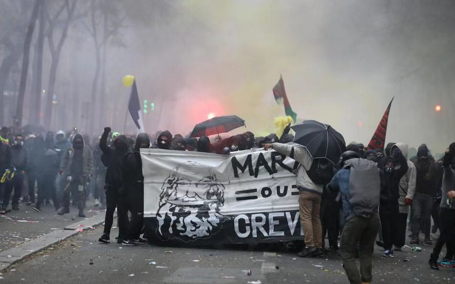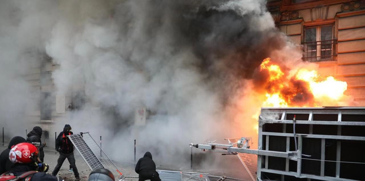 據(jù)《巴黎人報》報道,法國內(nèi)政部稱首都示威者為6.5萬人,法國總工會則宣稱巴黎25萬人上街游行。巴黎的游行隊伍于下午14點從巴黎北站出發(fā),揮舞著工會旗幟前往共和國廣場和民族廣場,沿途多條道路封鎖,一些蒙面暴徒與執(zhí)法人員發(fā)生沖突,警方動用催淚彈回擊,游行隊伍中還發(fā)生幾起縱火事件,消防人員及時進行了干預(yù)。當天,巴黎布署6000名警察和憲兵維持秩序,截至20點,警方對11490人進行了預(yù)防性檢查,拘留71人。