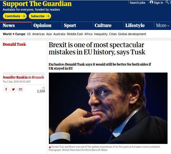 圖斯克上周卸任歐洲理事會(huì)主席一職,據(jù)英國(guó)《衛(wèi)報(bào)》5日?qǐng)?bào)道,他卸任后首次接受采訪時(shí)直言:英國(guó)脫歐是歐盟歷史上“最驚人的錯(cuò)誤之一(one of most spectacular mistakes)”。