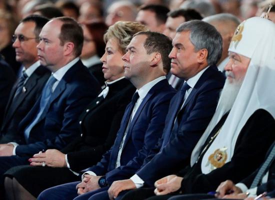 1月15日,俄羅斯總理梅德韋杰夫(右三)在莫斯科聽俄總統(tǒng)普京發(fā)表國(guó)情咨文。