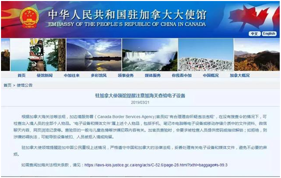 近日,中國人民共和國駐加拿大大使館發(fā)布消息:入境加拿大,微信、瀏覽器、移動(dòng)設(shè)備的儲(chǔ)存文件等都有可能被查,若拒絕檢查或?qū)⒈或?qū)逐遣返。