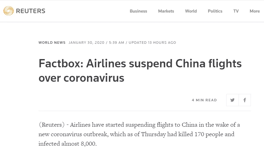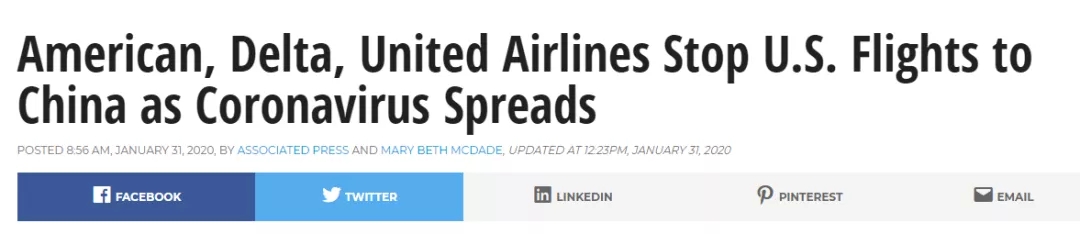美國當(dāng)?shù)貢r間1月31日,據(jù)KTLA新聞報道,3家美國航司已經(jīng)宣布:暫停所有中美航班!