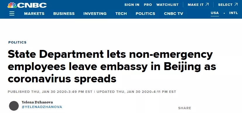 美國時間2020年1月30日,據(jù)CNBC報道,美國國務(wù)院剛剛發(fā)布最新消息,批準(zhǔn)美國駐北京大使館所有非緊急情況的政府雇員及其家屬離開,理由是目前新型冠狀病毒仍在中國繼續(xù)傳播。