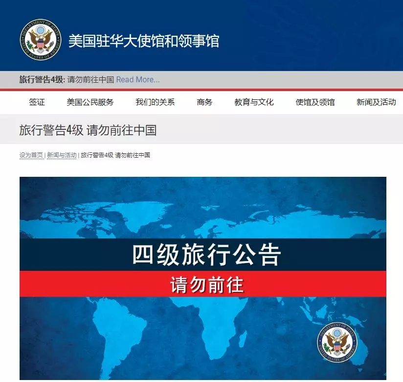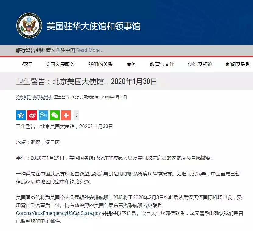 而美國駐華大使館在1月31日發(fā)布對中國的旅行4級警告,要求在美居民請勿前往中國。