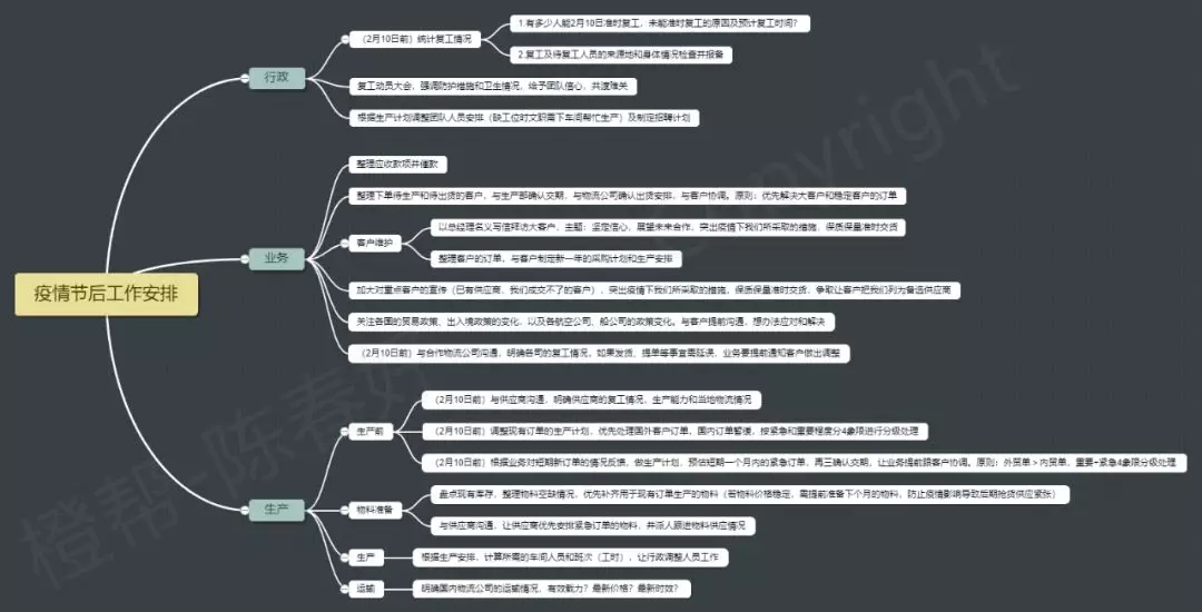 我們應(yīng)該如何做好疫情下節(jié)后復(fù)工的工作安排,在這次危機(jī)中,搶得一線生機(jī)呢?我從行政、業(yè)務(wù)、生產(chǎn)3個(gè)方面整理了一些工作思路給大家參考。