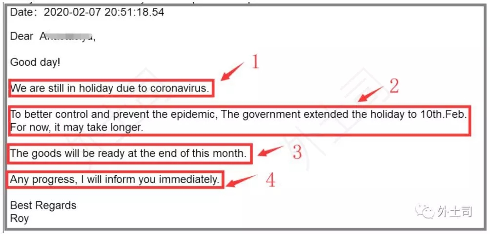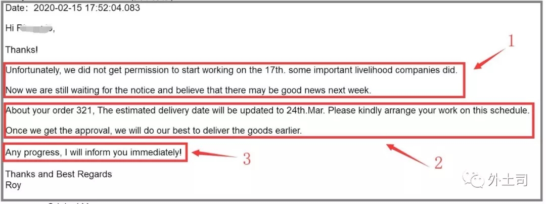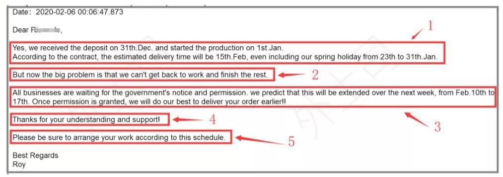 下面這封郵件是剛剛和客戶溝通的,相對應(yīng)地告知客戶17日的確沒法復(fù)工,可能還需要一周延遲。所以整個交貨期也順延一周,讓客戶提前做好準(zhǔn)備。