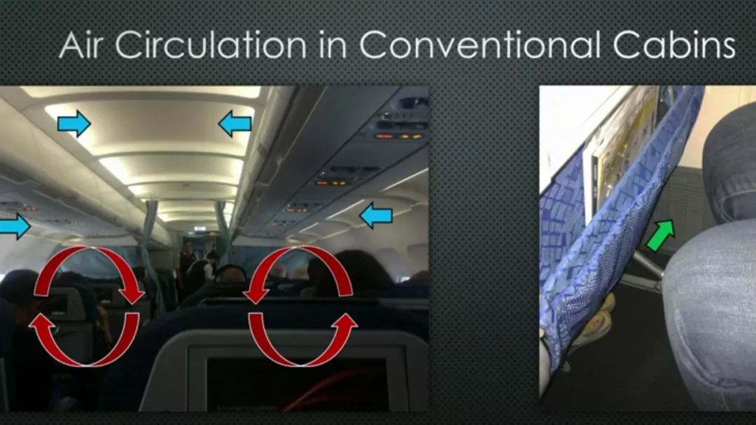 研究表明, 機艙中的空氣由機艙的頂部和側邊進入(藍色箭頭),然后經(jīng)過高效的過濾器離開機艙(綠色箭頭),有99.97%的病菌會被過濾掉。