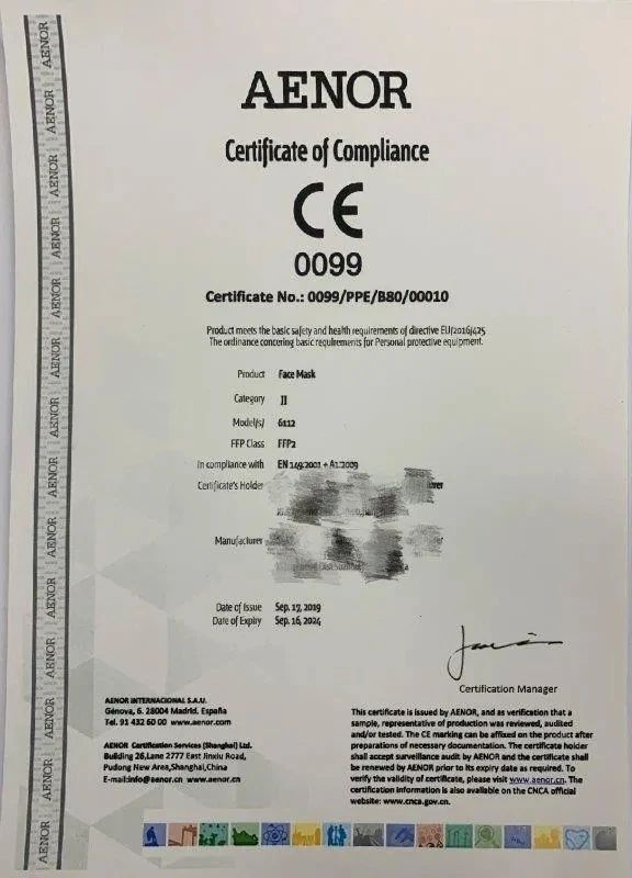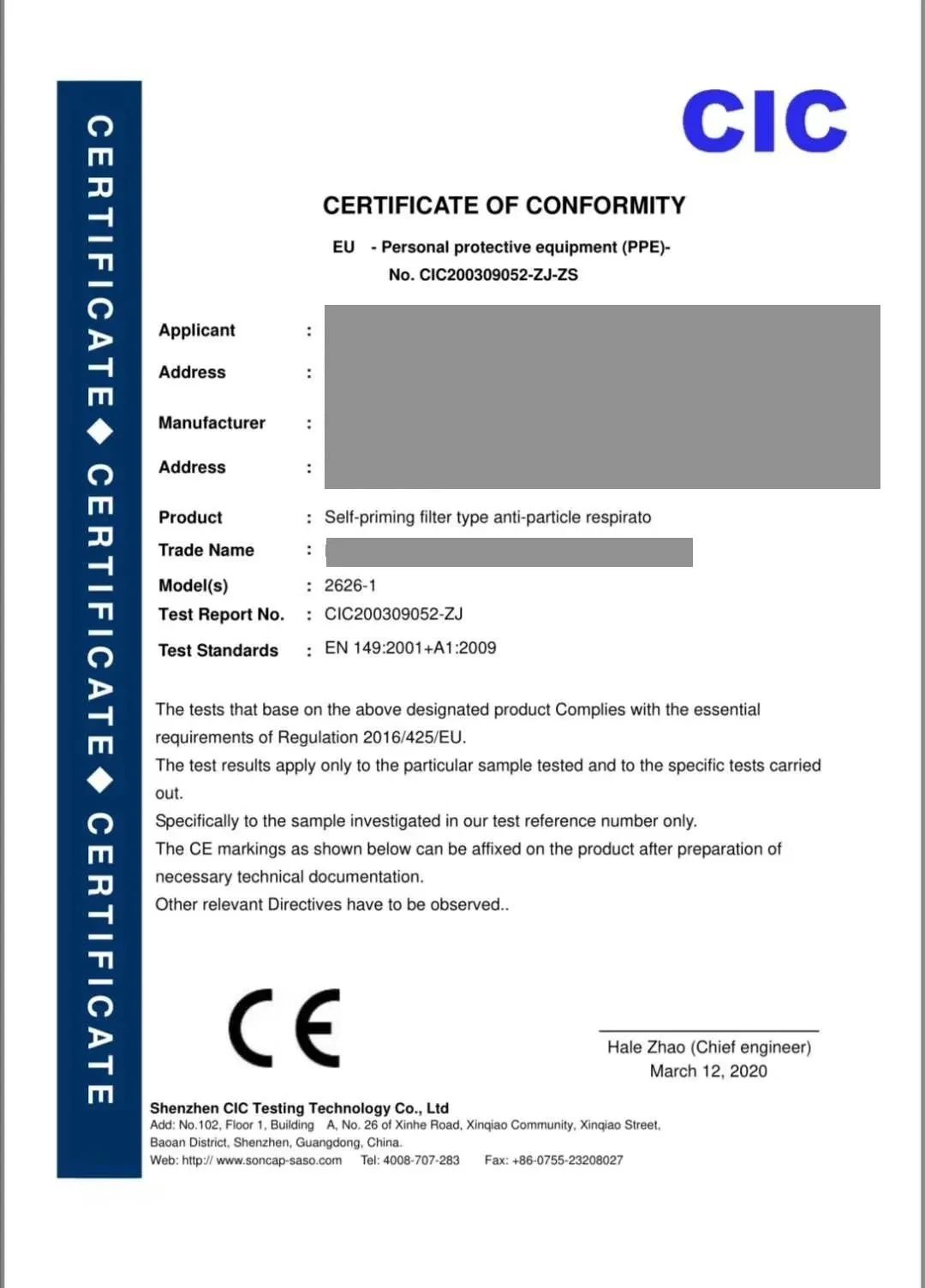 目前市場(chǎng)上流通的CE證書(shū)五花八門(mén),企業(yè)很難判斷哪些是合法的,哪些是不符合歐盟法律規(guī)定的。在此CCQS將收集到的一些不符合歐盟法規(guī)的防護(hù)口罩CE證書(shū)進(jìn)行展示和分析,希望可以幫助大家掌握辨別的方法。以下證書(shū)來(lái)自于網(wǎng)絡(luò),CCQS僅基于歐盟相關(guān)法規(guī)要求進(jìn)行點(diǎn)評(píng)。
