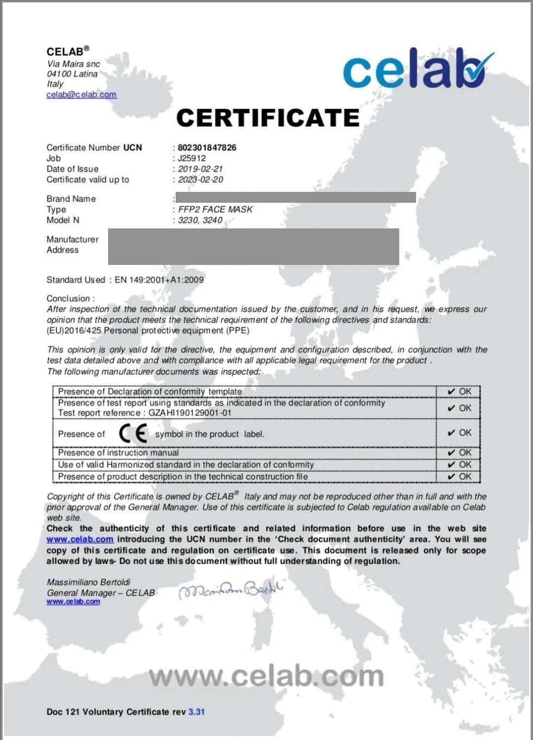 意大利認(rèn)證公告機(jī)構(gòu) CELAB SRL,公告號(hào)2037該機(jī)構(gòu)沒(méi)有PPE法規(guī) (EU) 2016/425授權(quán),因此無(wú)權(quán)簽發(fā)防護(hù)口罩CE證書(shū),該證書(shū)不符合歐盟法律規(guī)定!
