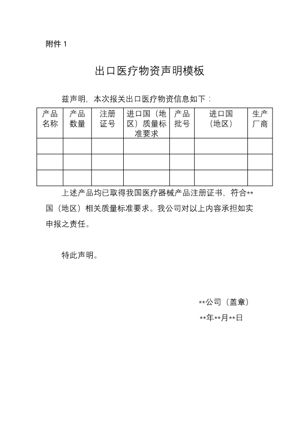我們打開出口醫(yī)療物資聲明模板發(fā)現(xiàn),內(nèi)容包括產(chǎn)品名稱、產(chǎn)品數(shù)量、注冊(cè)證號(hào)、進(jìn)口國(地區(qū))質(zhì)量標(biāo)準(zhǔn)要求、產(chǎn)品批號(hào)、進(jìn)口國(地區(qū))、生產(chǎn)廠商。