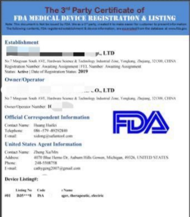 實際上,F(xiàn)DA注冊是沒有證書的,產(chǎn)品通過在FDA進行注冊,將取得注冊號碼,F(xiàn)DA會給申請人一份回函(有FDA行政長官的簽字),但不存在FDA證書一說。我們通??吹降倪@個證書是中介代理機構(gòu)(注冊代理)簽發(fā)給廠家,以證明其幫助該廠家完成了美國FDA要求的“生產(chǎn)設(shè)施注冊和產(chǎn)品類型注冊”,完成的標志是幫助廠家取得了FDA的注冊登記號。