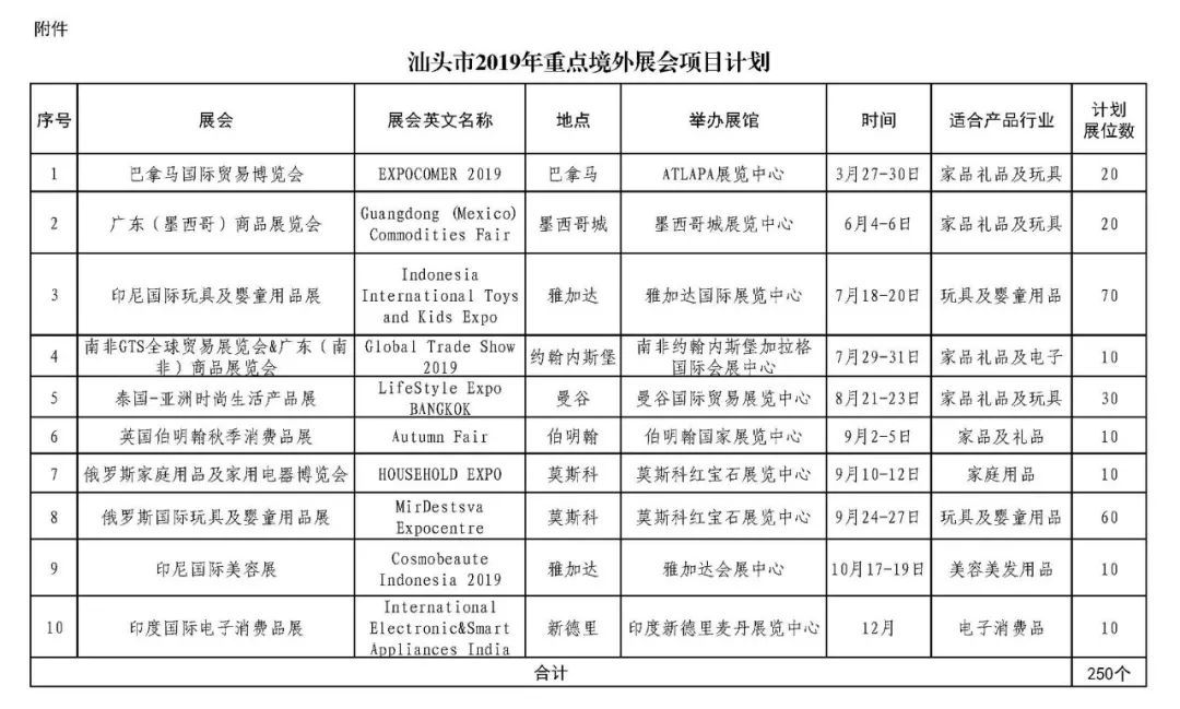 據(jù)了解,根據(jù)汕頭市2019年重點境外展會項目計劃,10個展會項目分別為巴拿馬國際貿(mào)易博覽會、廣東(墨西哥)商品展覽會、印尼國際玩具及嬰童用品展、南非GTS全球貿(mào)易展覽會&廣東(南非)商品展覽會、泰國-亞洲時尚生活產(chǎn)品展、英國伯明翰秋季消費品展、俄羅斯家庭用品及家用電器博覽會、俄羅斯國際玩具及嬰童用品展、印尼國際美容展、印度國際電子消費品展,適用產(chǎn)品涵蓋家品禮品、玩具、電子、美容美發(fā)等多個行業(yè),汕頭市計劃安排展位數(shù)共計250個。