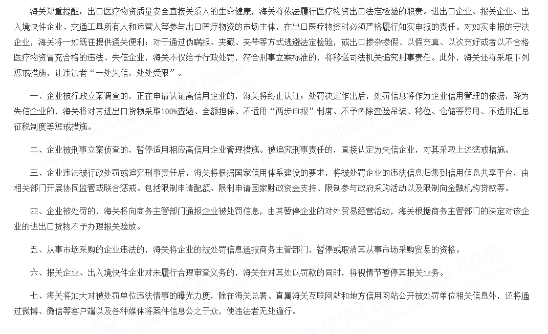 海關(guān)總署有關(guān)負(fù)責(zé)人表示,對(duì)如實(shí)申報(bào)的守法企業(yè),海關(guān)將一如既往提供通關(guān)便利;對(duì)于通過偽瞞報(bào)、夾藏、夾帶等方式逃避法定檢驗(yàn),或出口摻雜摻假、以假充真、以次充好或者以不合格醫(yī)療物資冒充合格的違法、失信企業(yè),海關(guān)不僅給予行政處罰,符合刑事立案標(biāo)準(zhǔn)的,將移送司法機(jī)關(guān)追究刑事責(zé)任。此外,海關(guān)還將加大對(duì)被處罰單位違法行為的曝光力度,使違法者無(wú)處遁形。