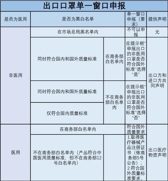 1.非醫(yī)用口罩出口實行白黑名單管理,商務(wù)部提供白名單,市場監(jiān)管總局提供黑名單。符合國外質(zhì)量標(biāo)準(zhǔn)看商務(wù)部白名單(需在名單內(nèi));國內(nèi)質(zhì)量標(biāo)準(zhǔn)看市場監(jiān)管總局黑名單(需不在名單內(nèi))。