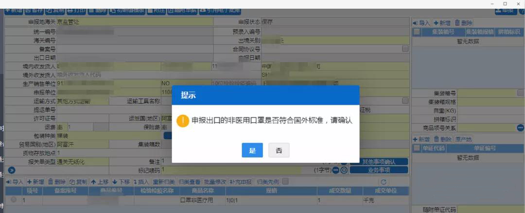 2.目前,單一窗口系統(tǒng)已更新,填報時,在出口報關(guān)單的“生產(chǎn)銷售單位”欄目填寫實際生產(chǎn)口罩企業(yè)名稱及代碼(不填銷售企業(yè)),并點擊是否符合國外標(biāo)準(zhǔn),此時,單一窗口系統(tǒng)會將申報的生產(chǎn)企業(yè)名單與商務(wù)部提供的白名單進(jìn)行核碰,核碰上的,則自動受理申報。