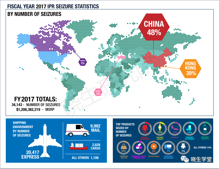 2018年4月,根據(jù)美國USTR(貿(mào)易代表處)發(fā)布2017年度特別301報(bào)告——《關(guān)于知識(shí)產(chǎn)權(quán)保護(hù)和盜版和假冒市場審查報(bào)告》,以及美國海關(guān)和邊境保護(hù)局(CBP)發(fā)布的《2017年財(cái)年美國海關(guān)知識(shí)產(chǎn)權(quán)侵權(quán)商品統(tǒng)計(jì)報(bào)告》,中國繼續(xù)位居美國海關(guān)知識(shí)產(chǎn)權(quán)侵權(quán)商品扣押商品來源國榜首。