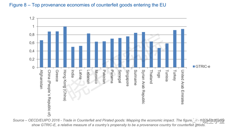 同美國一樣,歐盟于2018年發(fā)布的《SYNTHESIS REPORT ON IPR INFRINGEMENT 2018》指出,中國仍然是假冒商品來源的關(guān)鍵國家,而香港則是一個(gè)原產(chǎn)于中國的貨物的中轉(zhuǎn)站,同時(shí)從數(shù)據(jù)中看到連續(xù)三年中國和香港位居假冒產(chǎn)品來源地榜首。