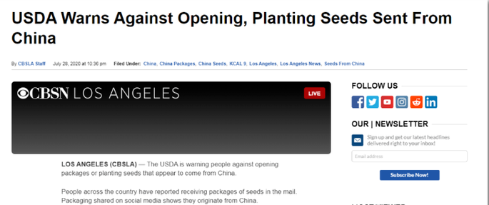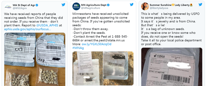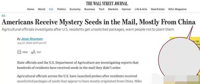 美國(guó)華爾街日?qǐng)?bào)近期發(fā)布了一篇報(bào)道,在報(bào)道中指出美國(guó)維吉尼亞和其他12個(gè)州超過(guò)1000人,在過(guò)去一個(gè)月收到了含有種子的不明郵包。