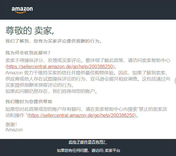 跨境賣家刷單很瘋狂的時(shí)候,華爾街日?qǐng)?bào)甚至專門報(bào)道過(guò)亞馬遜中國(guó)賣家的“刷單”行為,披露過(guò)空包、職業(yè)測(cè)評(píng)員等存在。今年7月末,亞馬遜還給疑似刷單的賣家們?nèi)喊l(fā)了郵件稱賣家有為買家評(píng)論提供報(bào)酬的行為,賣家們一時(shí)都暫緩了刷單行為。