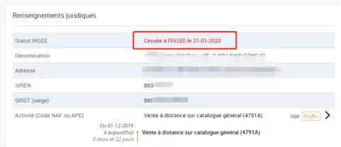 輸入9位siren號(hào)查詢,出現(xiàn)紅色信息表示已注銷