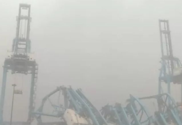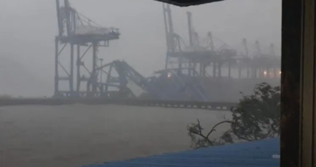 印度西海岸遭受暴風雨的襲擊,印度最大的集裝港口孟買港的三臺集裝箱起重機被吹強風倒塌。