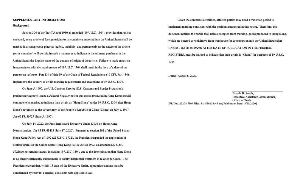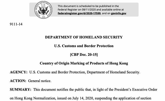 香港《南華早報》援引美國海關(guān)11日公告稱,根據(jù)美國總統(tǒng)在7月14日簽署的行政命令,由于美國認定“香港不再享有高度自治,因此不再保證繼續(xù)享有與中國不同的特殊待遇”。