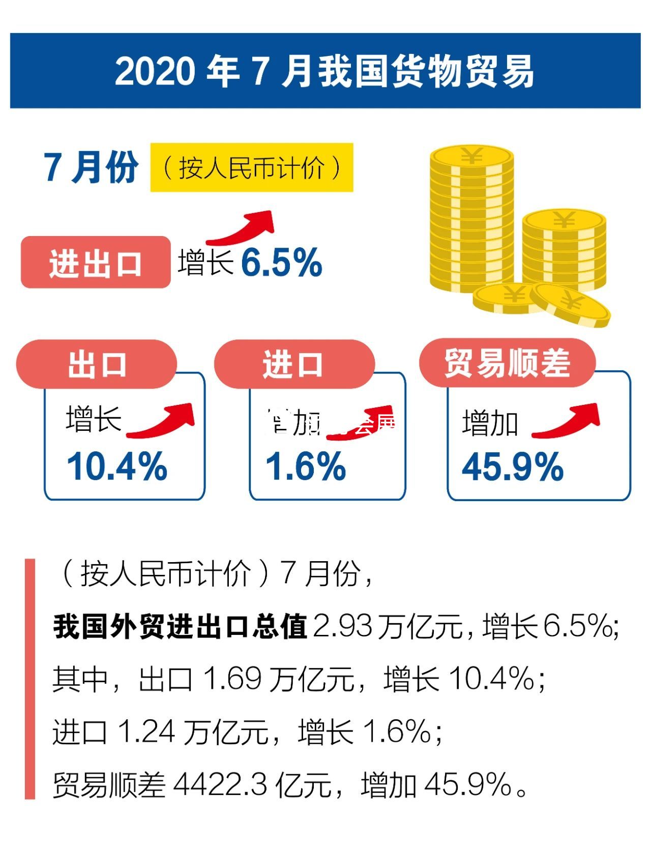 繼6月進出口增速雙雙回正后,7月我國外貿(mào)進出口2.93萬億元,增長6.5%。其中,外貿(mào)出口強勢實現(xiàn)兩位數(shù)增長,達到1.69萬億元,增長10.4%;進口1.24萬億元,增長1.6%。