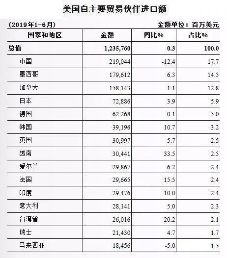 美國最大的進口額2019年1~6月當(dāng)時中國占比為17.7%,其次則是墨西哥14.5%,第三大的是加拿大12.8%,第四大的是日本5.9%,第五大是德國5.0%,第六大是韓國3.2%,英國是第七大2.5%,第八大的是越南2.5%,第九大的是愛爾蘭2.4%,第九大的是法國2.4%,第十大是印度2.4%,第十一大的是意大利2.3%,第十二大的臺灣地區(qū)。