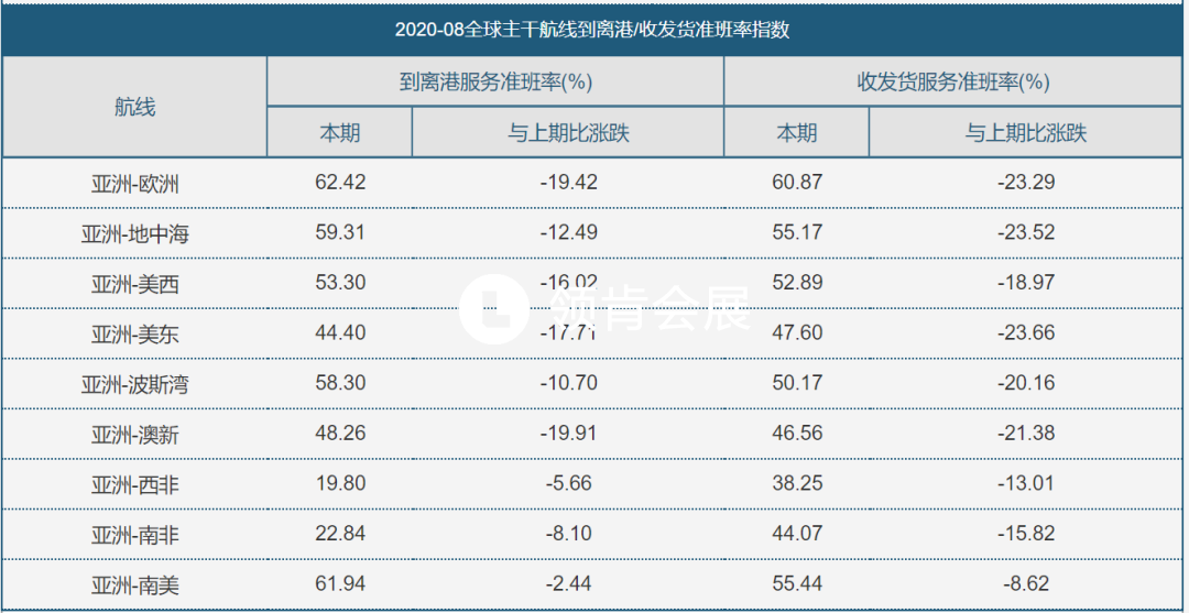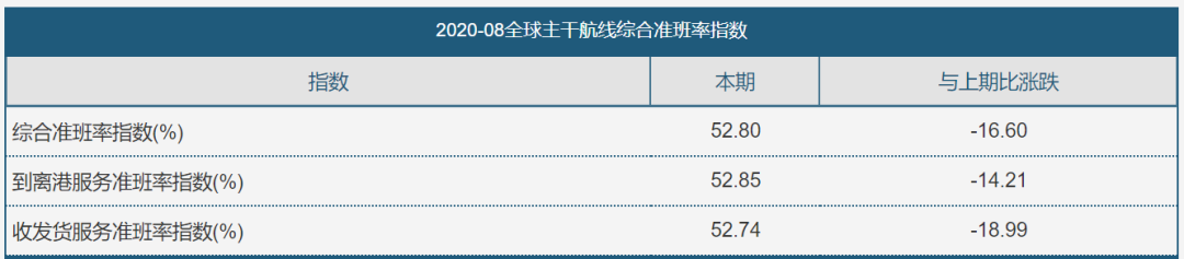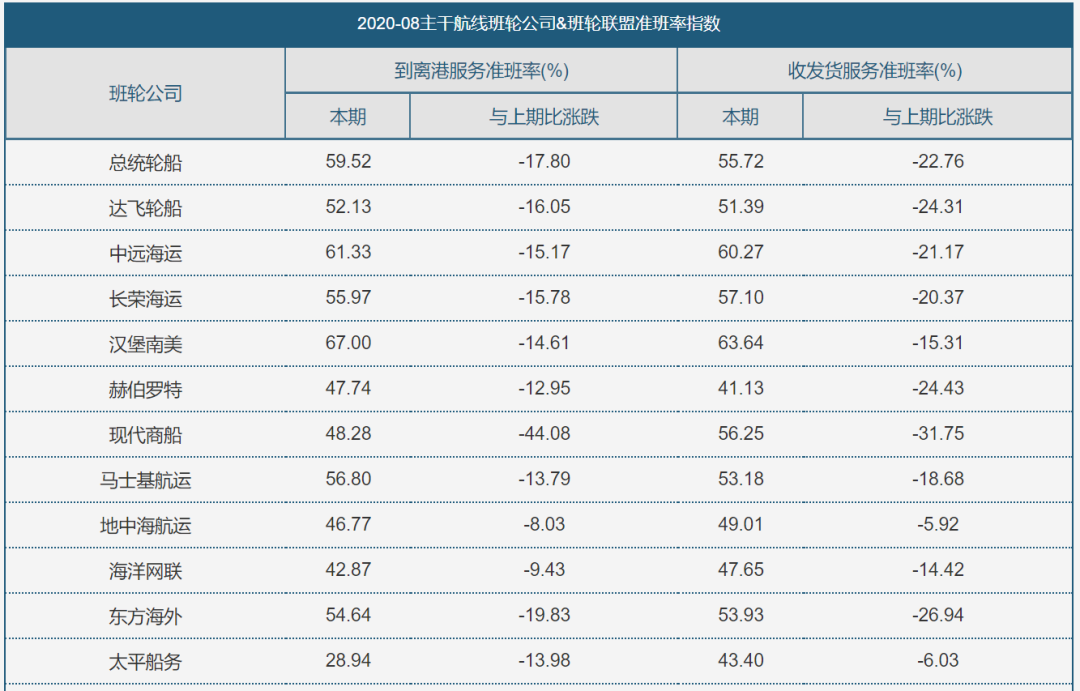 8月份,全球9條主干航線綜合準(zhǔn)班率為52.8%,環(huán)比下降16.6%,其中,到離港和收發(fā)貨準(zhǔn)班率分別為52.85%和52.74%,較7月份分別減少14.21%和18.99%。