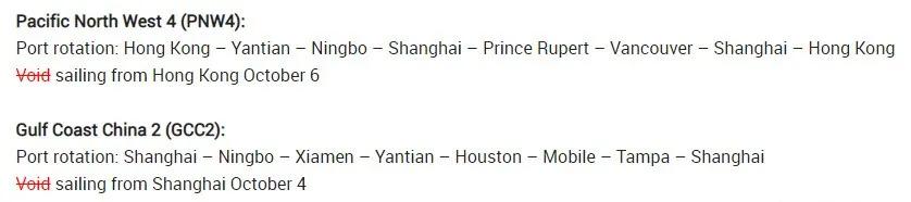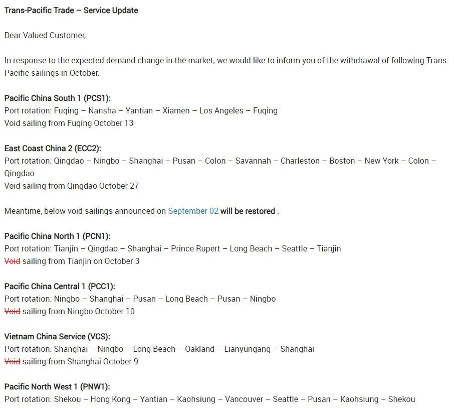 該公司援引北美過去60天出現(xiàn)的強(qiáng)勁進(jìn)口量(預(yù)計(jì)至少要持續(xù)到11月份)為由,宣布取消所有跨太平洋航線的停航。