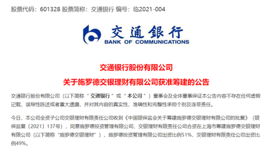 剛剛,交通銀行發(fā)布公告,宣布施羅德投資管理有限公司(以下簡(jiǎn)稱“施羅德投資集團(tuán)”)與交行全資子公司交銀理財(cái)有限責(zé)任公司(以下簡(jiǎn)稱“交銀理財(cái)”)合資籌建施羅德交銀理財(cái)有限公司(以下簡(jiǎn)稱“施羅德交銀理財(cái)”)一事正式獲批。