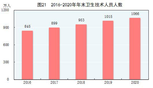 年末全國(guó)共有醫(yī)療衛(wèi)生機(jī)構(gòu)102.3萬(wàn)個(gè),其中醫(yī)院3.5萬(wàn)個(gè),在醫(yī)院中有公立醫(yī)院1.2萬(wàn)個(gè),民營(yíng)醫(yī)院2.4萬(wàn)個(gè);基層醫(yī)療衛(wèi)生機(jī)構(gòu)97.1萬(wàn)個(gè),其中鄉(xiāng)鎮(zhèn)衛(wèi)生院3.6萬(wàn)個(gè),社區(qū)衛(wèi)生服務(wù)中心(站)3.5萬(wàn)個(gè),門(mén)診部(所)29.0萬(wàn)個(gè),村衛(wèi)生室61.0萬(wàn)個(gè);專業(yè)公共衛(wèi)生機(jī)構(gòu)1.4萬(wàn)個(gè),其中疾病預(yù)防控制中心3384個(gè),衛(wèi)生監(jiān)督所(中心)2736個(gè)。年末衛(wèi)生技術(shù)人員1066萬(wàn)人,其中執(zhí)業(yè)醫(yī)師和執(zhí)業(yè)助理醫(yī)師408萬(wàn)人,注冊(cè)護(hù)士471萬(wàn)人。醫(yī)療衛(wèi)生機(jī)構(gòu)床位911萬(wàn)張,其中醫(yī)院713萬(wàn)張,鄉(xiāng)鎮(zhèn)衛(wèi)生院139萬(wàn)張。全年總診療人次[62]78.2億人次,出院人數(shù)[63]2.3億人。截至年末,全國(guó)累計(jì)報(bào)告新型冠狀病毒肺炎確診病例87071例,累計(jì)治愈出院病例82067例,累計(jì)死亡4634人。全國(guó)共有8177家醫(yī)療衛(wèi)生機(jī)構(gòu)提供新型冠狀病毒核酸檢測(cè)服務(wù),總檢測(cè)能力達(dá)到1153萬(wàn)份/天。