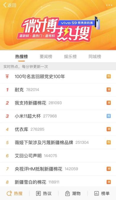 目前,H&M事件在網(wǎng)上仍在發(fā)酵,自事情發(fā)生以來(lái),H&M相關(guān)話題持續(xù)占據(jù)微博等社交平臺(tái)熱搜榜單,耐克、優(yōu)衣庫(kù)等品牌也因網(wǎng)友指出抵制新疆棉花被沖上微博熱搜。