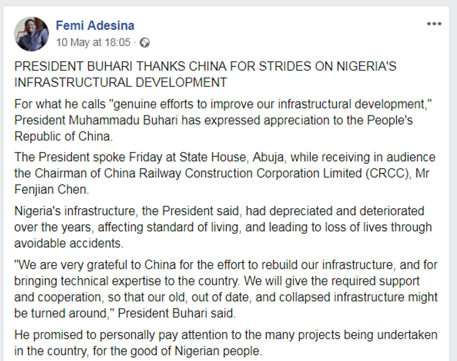 中國外交部發(fā)言人陸慷也表示:尼日利亞是非洲人口最多的發(fā)展中國家,中國是世界上最大的發(fā)展中國家,中尼合作平等互利,是兄弟般的南南合作。我們高度重視深化中尼合作關(guān)系,愿同尼方加強(qiáng)發(fā)展戰(zhàn)略對接,更好地實(shí)現(xiàn)互利共贏。