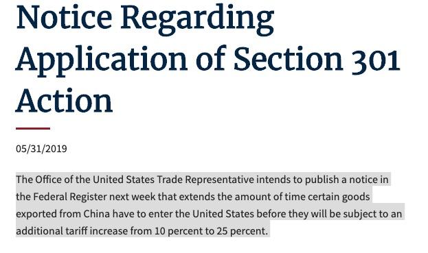 根據(jù)該公告,2019年5月10日前從中國出口到美國的產(chǎn)品在進(jìn)入美國后,仍然會被額外征收10%的關(guān)稅,這些商品原定會在2019年6月1日被加征25%的關(guān)稅,但是USTR將這最終時間延長至6月15日。