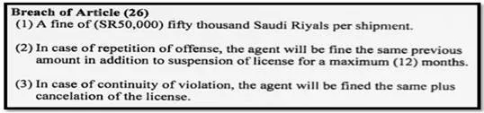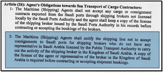 根據(jù)沙特港務(wù)局(Saudi Port Authority)在第 26 條中的規(guī)定,所有沙特收貨人或通知人,如果為當(dāng)?shù)刎涍\(yùn)代理,則必須獲得由公共運(yùn)輸局(Public Transport Authority (PTA))簽發(fā)的貨運(yùn)代理許可證,否則由此引起的罰金或不能清關(guān)的風(fēng)險(xiǎn)由客戶(hù)自行承擔(dān)。