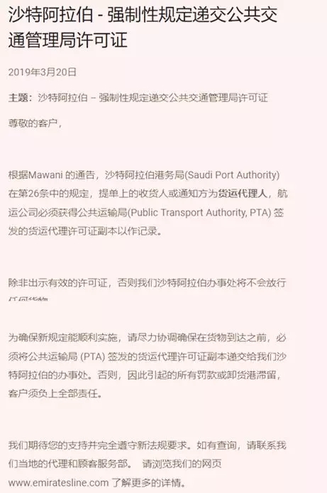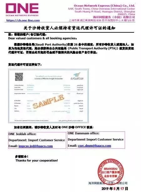 為確保新規(guī)定能順利實(shí)施,請(qǐng)盡力協(xié)調(diào)確保在貨物到達(dá)之前,必須將公共運(yùn)輸局 (PTA) 簽發(fā)的貨運(yùn)代理許可證副本遞交給我們沙特阿拉伯的辦事處。否則,因此引起的所有罰款或卸貨港滯留,客戶(hù)須負(fù)上全部責(zé)任。