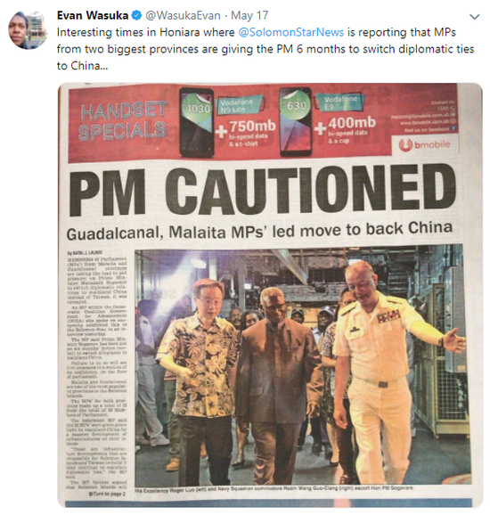 然而,“金援”未能成為一顆“定心丸”。5月17日,所羅門(mén)當(dāng)?shù)貓?bào)紙一篇報(bào)道再度在島內(nèi)引起熱議。當(dāng)日的頭版頭條上以黑色粗體字寫(xiě)著“總理注意”(PM CAUTIONED),內(nèi)文則稱,所羅門(mén)兩位最大省份的國(guó)會(huì)議員要求總理索加瓦雷在六個(gè)月內(nèi)與臺(tái)灣“斷交”,與大陸建交,否則他們將會(huì)向總理投下不信任投票。