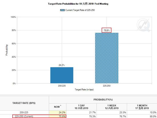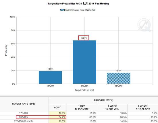 芝商所“美聯(lián)儲(chǔ)觀察工具”對(duì)2019年6月和7月聯(lián)邦基金目標(biāo)利率的預(yù)測(cè)。