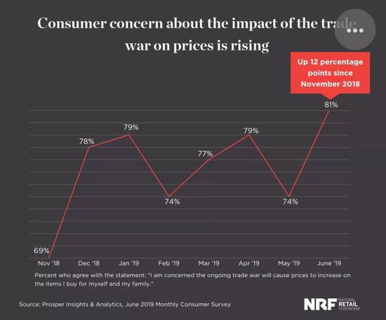 美國民眾對于加征關稅的擔憂,在美國國家零售聯(lián)合會6月份的調查中同樣有所體現(xiàn)。81%的消費者“擔心持續(xù)的貿易戰(zhàn)會導致價格上漲”,比2018年11月以來增長了12個百分點。