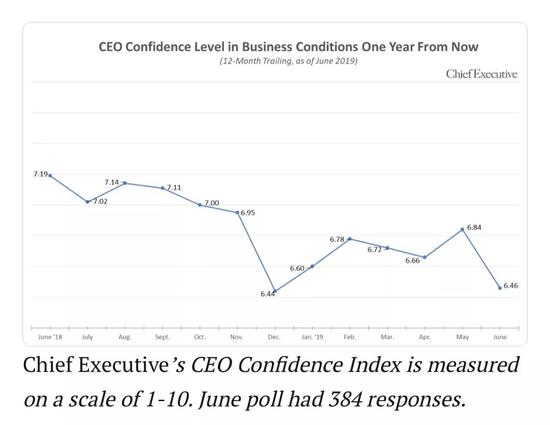 受關稅政策不確定性影響,美國企業(yè)承壓巨大。一項面向384名企業(yè)CEO的調查顯示,受到美國政府關稅和貿易政策的影響,美國企業(yè)CEO信心指數(shù)在下降,與去年同期相比,企業(yè)CEO信心下降了10%,而今年5月中美貿易磋商未果,也導致了6月份企業(yè)CEO信心指數(shù)猛跌。