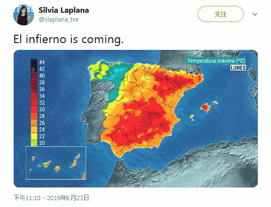 西班牙是本次受熱浪襲擊最嚴重的國家之一。據(jù)西班牙氣象部門預(yù)測,該國大部分地區(qū)的氣溫都將達到至少36度,中部地區(qū)超過40攝氏度,部分地區(qū)可達42度。西班牙氣象學(xué)家西爾維婭·拉普拉娜(Silvia Laplana)24日發(fā)表推特稱:“地獄來了。”
