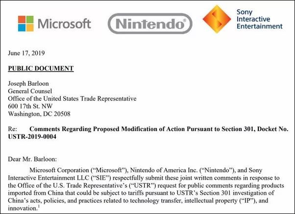 三大廠商17日發(fā)給美國貿(mào)易代表辦公室的聯(lián)名信長達(dá)7頁。信中態(tài)度明確,反對美國對產(chǎn)自中國的游戲主機(jī)加征關(guān)稅,同時(shí)寓情于理,擺出事實(shí),苦口婆心告訴美國為啥必須這么做。