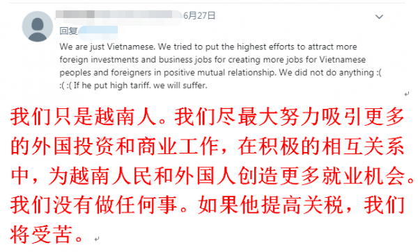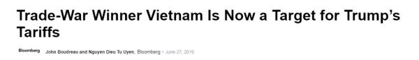 而關(guān)于越南為什么會(huì)被美國(guó)“瞄準(zhǔn)”,彭博社在6月27日的報(bào)道中給出了一種猜想。“越南近期中美貿(mào)易戰(zhàn)‘大贏家’的名聲可能引起了美國(guó)總統(tǒng)特朗普不必要的關(guān)注”,報(bào)道稱。