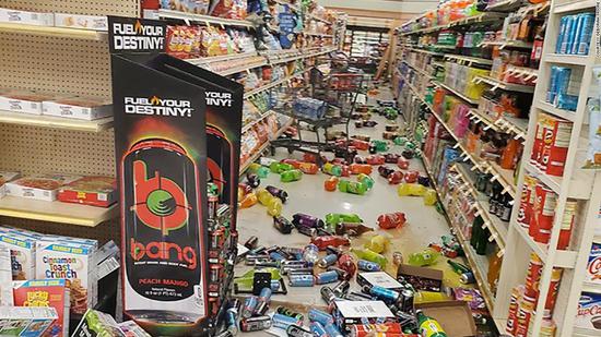 據(jù)美國地質(zhì)調(diào)查局地震信息網(wǎng)消息,本次地震發(fā)生于當(dāng)?shù)貢r(shí)間4日上午10時(shí)33分(北京時(shí)間5日1時(shí)33分),震中位于瑟爾斯谷西南12公里處,震源深度10.7公里。距離震中約270公里的洛杉磯和周邊城市有明顯震感,當(dāng)?shù)胤课輷u晃了10秒鐘左右。此次地震造成部分店鋪的商品從貨架倒塌,從現(xiàn)場圖看,不少飲料灑落一地。