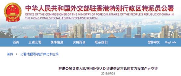 中國駐英國大使、外交部發(fā)言人發(fā)聲之外,位于香港的外交部駐港公署負責人也在7月3日表態(tài)。
