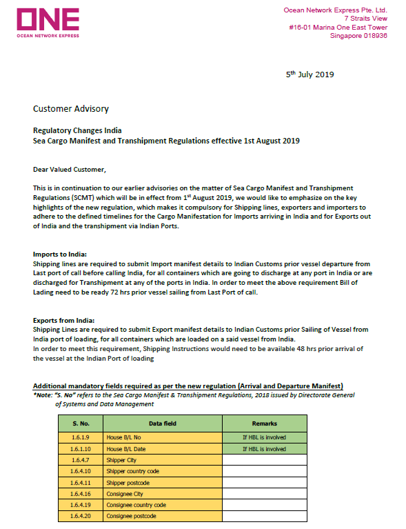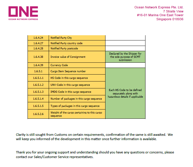 目前,船公司ONE已發(fā)出最新通告,請(qǐng)大家按照規(guī)定執(zhí)行,避免不必要的麻煩。