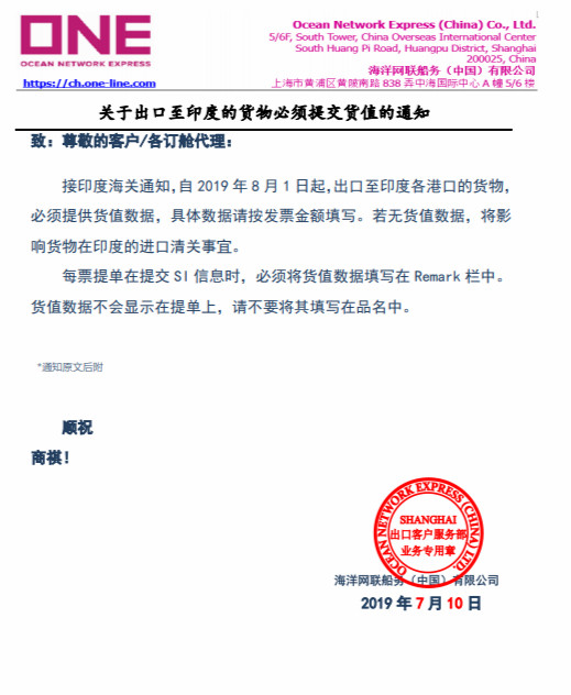 接印度海關(guān)通知,自2019年8月1日起,出口至印度各港口的貨物,必須提供貨值數(shù)據(jù),具體數(shù)據(jù)請(qǐng)按發(fā)票金額填寫。若無貨值數(shù)據(jù),將影響貨物在印度的進(jìn)口清關(guān)事宜。