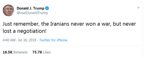 俄羅斯衛(wèi)星通訊社30日?qǐng)?bào)道稱(chēng),特朗普29日在推特上寫(xiě)道,“只需要記住一點(diǎn),(雖然)伊朗從未贏得一場(chǎng)戰(zhàn)爭(zhēng),但(他們)從未輸過(guò)一場(chǎng)談判”。報(bào)道稱(chēng),對(duì)于這條推特,特朗普并未作出更多解釋。