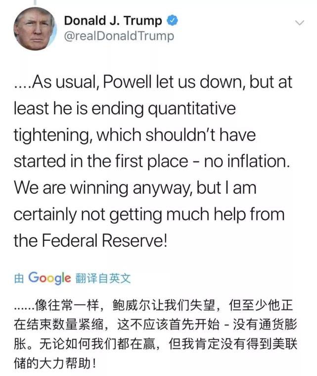 特朗普表示:“和往常一樣,鮑威爾讓我們失望了,但至少他結(jié)束了量化緊縮政策,這本來就不應該開始——沒有通貨膨脹。我肯定不會從美聯(lián)儲得到多少幫助!”