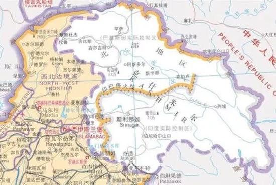 ▲圖中白色區(qū)域?yàn)榭耸裁谞柕貐^(qū),其中的黃色線條為印巴?;鹁€,巴基斯坦控制?;鹁€北部地區(qū)和西部少部分地區(qū),印度控制其他占整個克什米爾3/5的區(qū)域